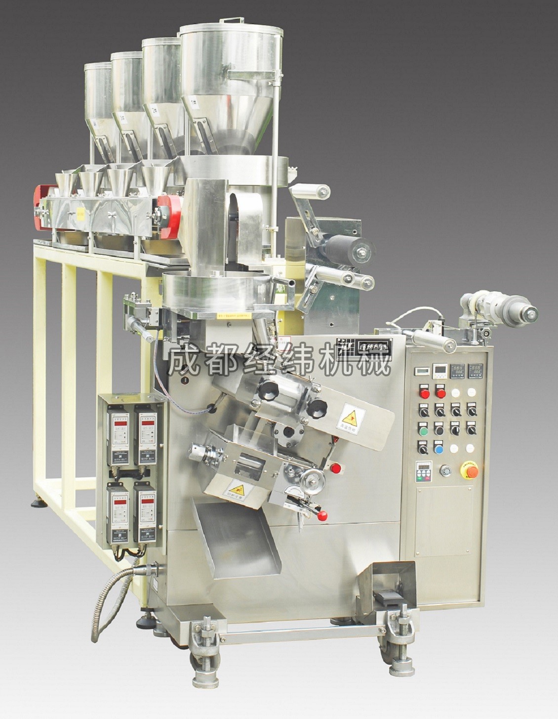 2、粉料采用模具計量方式;脫水蔬菜或顆粒采用圓盤或直線振動下料,最終實現(xiàn)多種物料混合包裝。